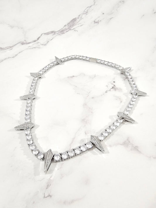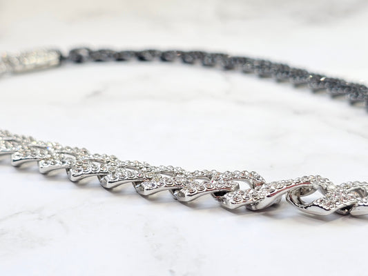 Explora la elegancia en nuestra cadena robusta con dijes de picos y deslumbrantes incrustaciones de zirconias blancas. Esta pieza fusiona fuerza y lujo, combinando el grosor de la cadena con la sutileza de las zirconias. Haz una audaz declaración de estilo con este collar único que añade brillo y distinción a tu atuendo, celebrando la exquisitez de la elegancia moderna.