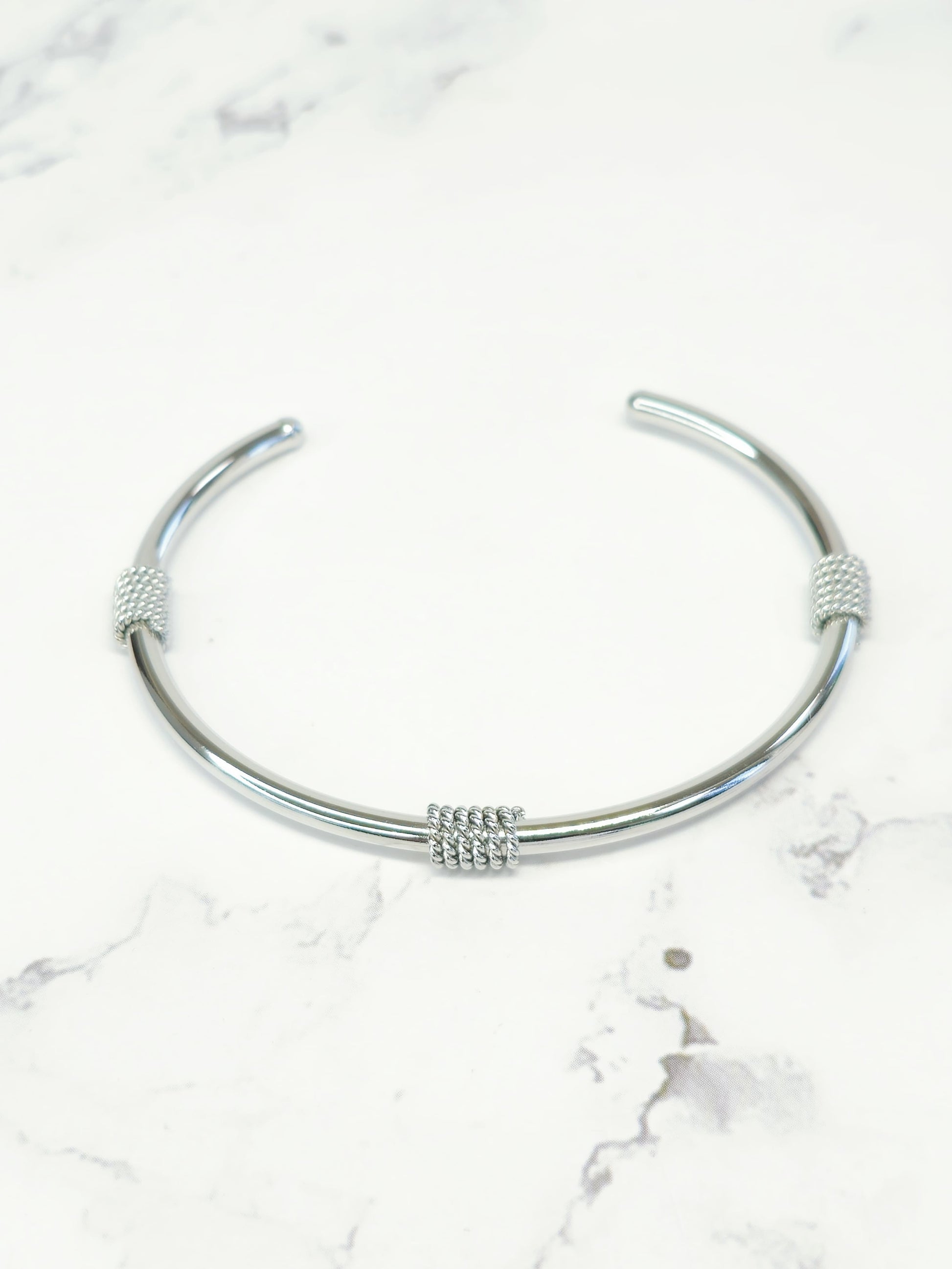 Explora la elegancia minimalista con nuestro brazalete delgado de acero inoxidable, caracterizado por su superficie lisa y tres enredaderas de alambre trenzado que aportan un toque moderno. Este accesorio combina la simplicidad con un diseño intrincado, creando un brazalete que es tanto sofisticado como contemporáneo. Eleva tu estilo diario con esta pieza que fusiona la sutileza del acero inoxidable con la modernidad de los detalles trenzados.