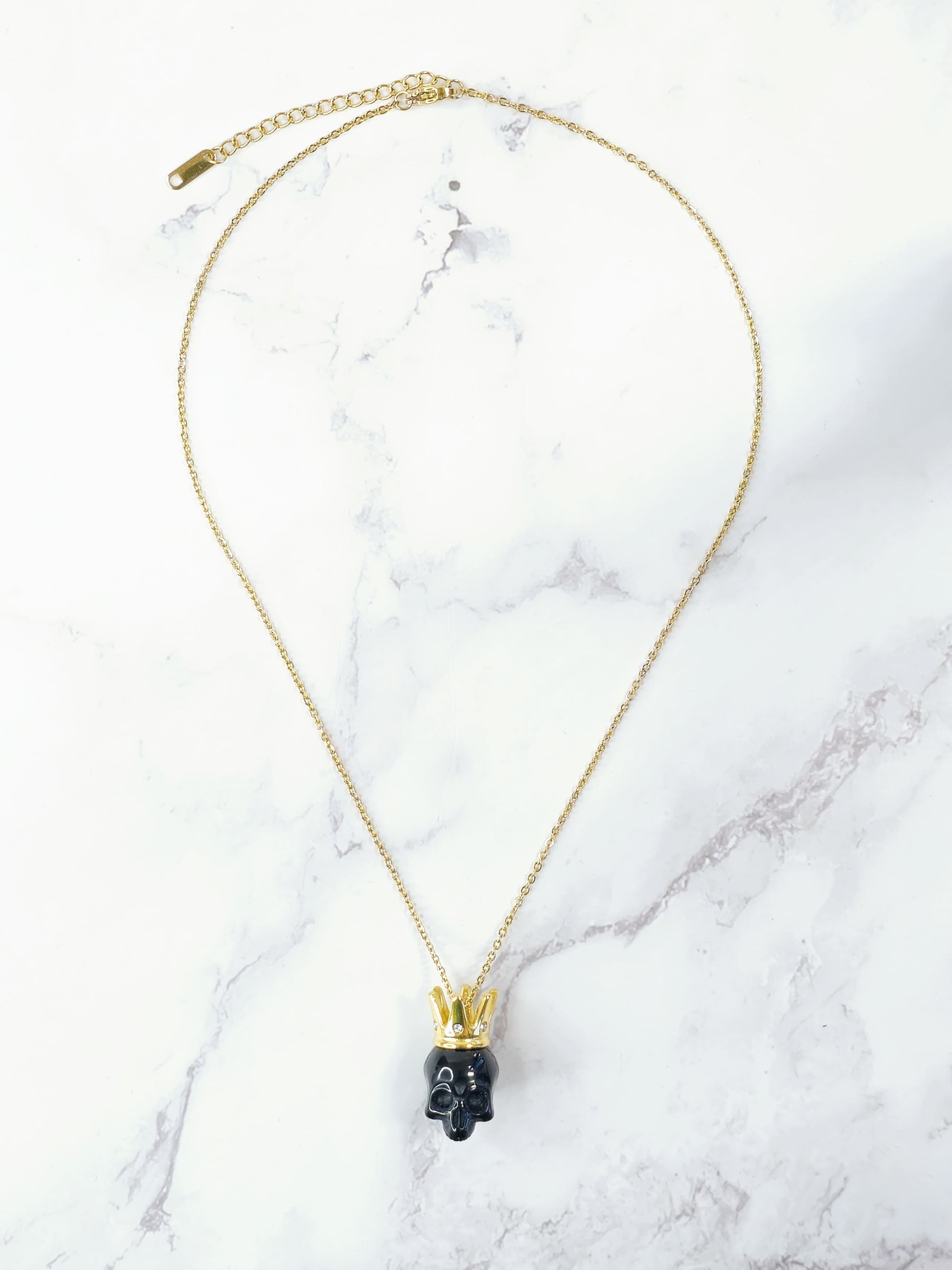 Descubre la audacia en nuestro collar de acero inoxidable dorado, destacado por un vívido dije negro de cráneo coronado. Las incrustaciones de zirconias en la corona añaden un toque de lujo a esta pieza única. Esta fusión de elementos contrastantes equilibra la elegancia con la oscuridad, creando un accesorio distintivo que atrae miradas. Haz una declaración de estilo audaz con este collar que refleja la dualidad entre lo misterioso y lo refinado.