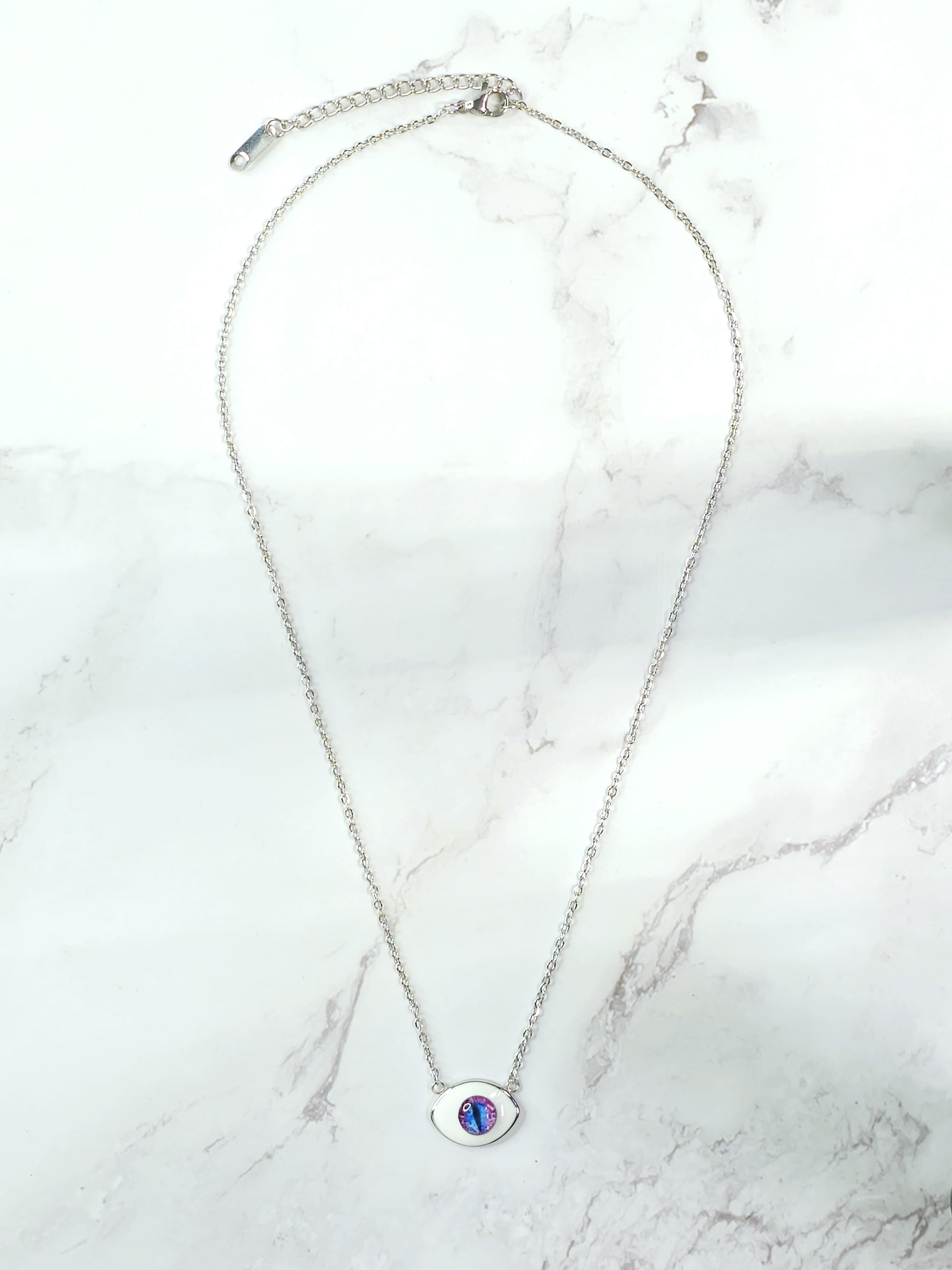 Explora la singularidad con nuestro collar de acero inoxidable, destacado por un intrigante dije de ojo con un iris en cautivador color morado. Este accesorio no solo añade un toque de misterio a tu estilo, sino que también simboliza la perspicacia y la intuición. La combinación de la robustez del acero inoxidable y el vibrante color morado crea una pieza única que te invita a expresar tu individualidad con elegancia. Eleva tu look con este collar que atraerá miradas y despertará conversaciones.